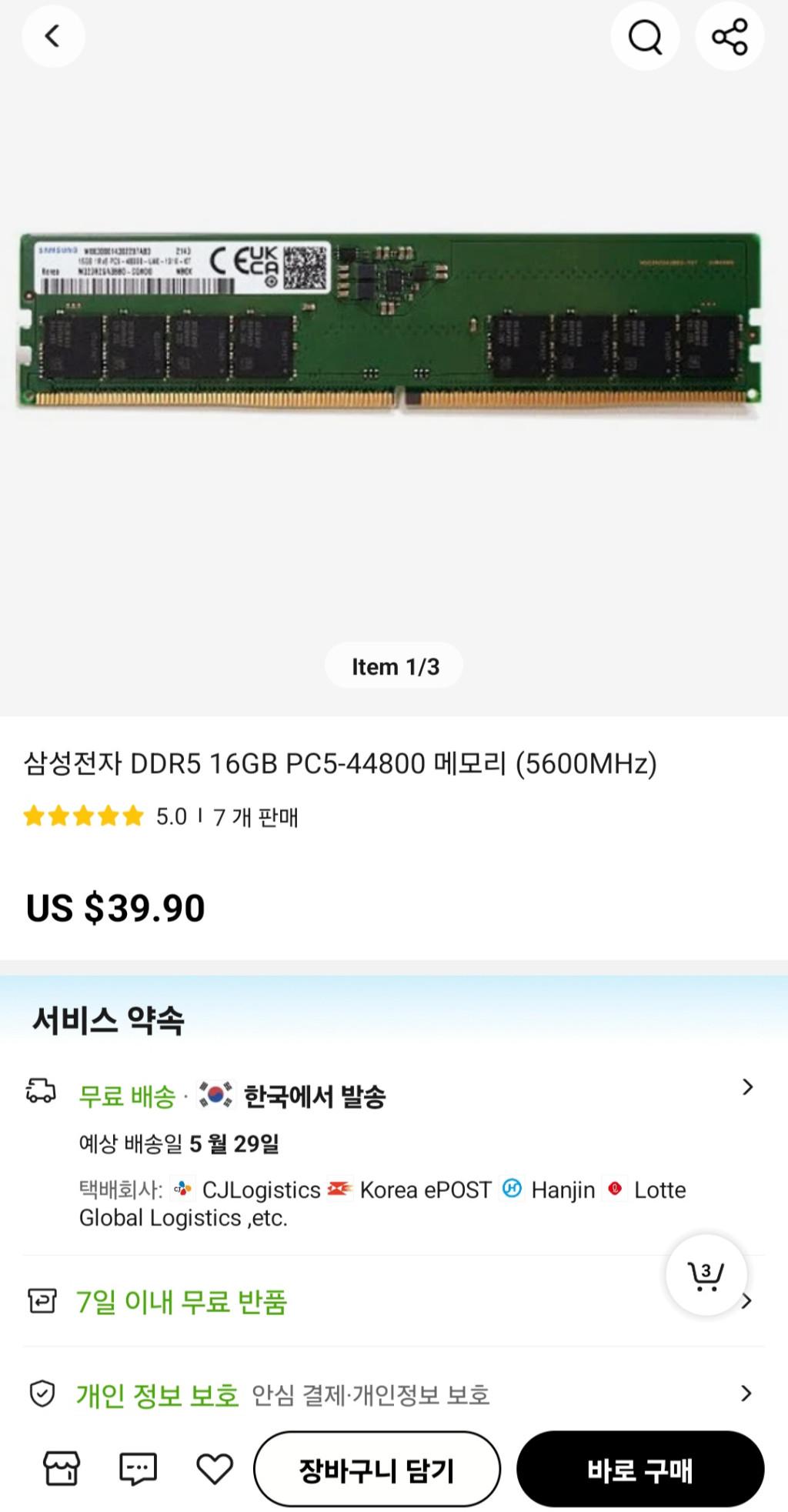 [알리익스프레스] 국내정발 삼성전자 PC5-44800 16GB 4.8만원