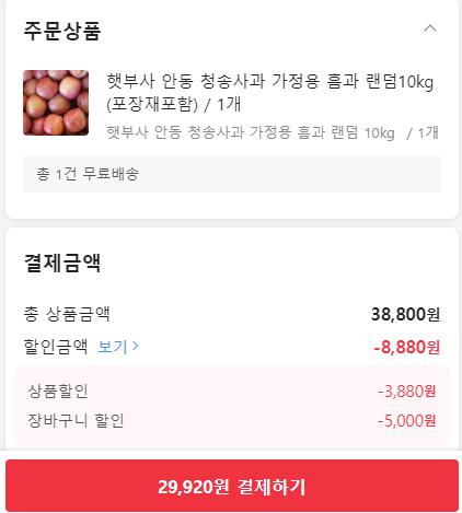여기서 쿠폰 받아서 구매하시면 9kg 29,920원 나옵니다. 1kg당 3,330원정도 나오네요.가격대 괜찮은거같아 공유드려봅니다. 최근들어 사과가격이 많이 비쌌는데 쿠폰적용하니 많이 저렴해지네요.쿠폰은 아래링크통해 받으시면 됩니다.https://mw.wemakeprice.com/special/category/5006048