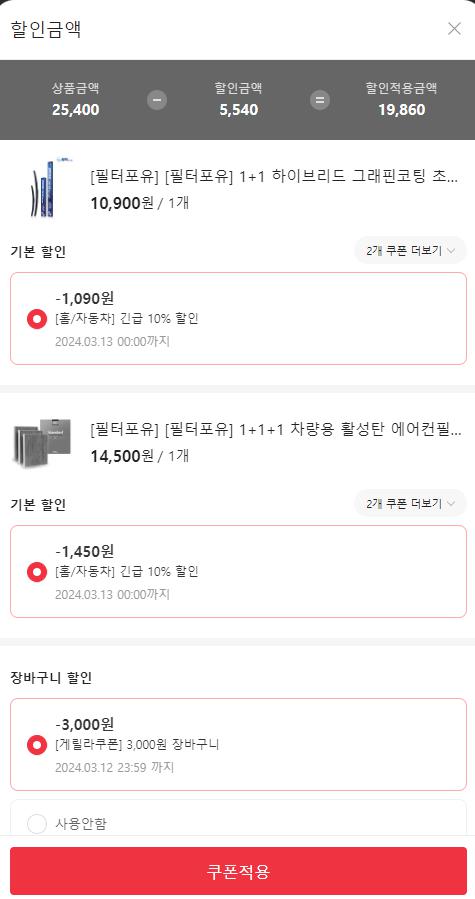 2만원이상 3천원 할인쿠폰 적용 가능해서 필터랑 와이퍼 같이 사는게 저렴하게 구매되는 것 같습니다.여름대비해서 미리 하나 사두시는것도 나쁘지않을 것 같습니다.비싼 필터 아무리 사도 여름에는 에어컨을 자주틀다보니 자주 갈아주는것만큼 좋은건 없더라구요.3천원 쿠폰은 아래링크에서 받으셔서 적용하시면 됩니다.https://mw.wemakeprice.com/special/category/5005873