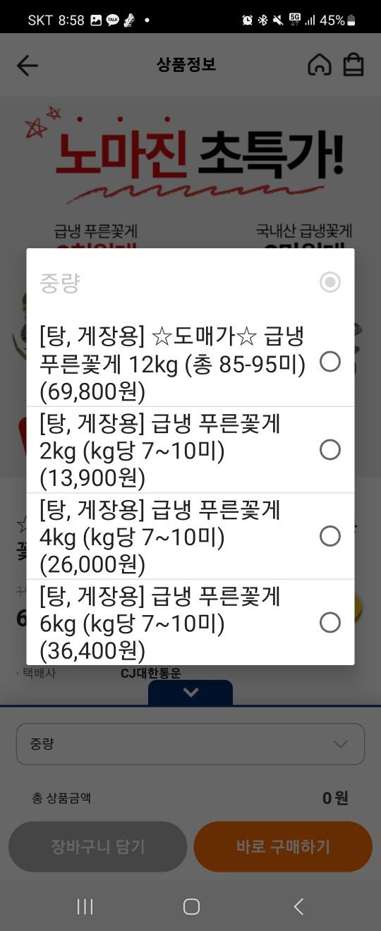 푸른꽃게가 한참 이슈였던 것 혹시 아시나요?! 해당 사이트에서 급냉 푸른꽃게를 키로당 6950원으로 저렴한 가격에 판매하고 있어요2kg, 4kg, 6kg, 12kg 구매 가능하고 4,500원의 배송비가 붙습니다저도 이전에 구매해서 쪄먹었고 로제파스타도 해먹었는데 상당히 괜찮았습니다총평점이 5인만큼 사람들의 평가도 뛰어나서 믿고 먹을 수 있는 제품입니다 :)