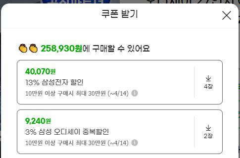 안녕하세요.삼성전자 디스플레이 공식파트너 (주)큐소닉 입니다.지마켓 "오디세이 위크" 행사를 통해, 삼성 오디세이 G5 C27G54T 게이밍 모니터를 최대 23% 할인 판매하고 있사오니 많은 관심 부탁 드리겠습니다~감사합니다.※ 행사 마켓 : 지마켓※ 행사 일정 : 4월 4일 ~ 4월 14일 (지마켓 재원 소진 시 조기 종료 및 할인율이 변동 될 수 있음 / 선착순)※ 행사 혜택 : 13% 할인 + 3% 중복할인 + 7% 카드할인 (하나 / BC / 스마일) => 최대 23% 할인삼성 오디세이 G5 C27G54T 게이밍 모니터27인치 / QHD / 144Hz / VA / 1ms / 커브드 / HDR10 / AMD FreeSync 프리미엄기존 판매가 : 319,000원 => 최대 할인가 : 240,810원https://item.gmarket.co.kr/Item?goodscode=1867981499삼성 오디세이 G3 S32AG320 게이밍 멀티스탠드32인치 / FHD / 165Hz / 1ms / 평면 / AMD FreeSync 프리미엄 / 피벗(회전), 엘리베이션(높낮이), 스위블(좌우), 틸트(상하) 기능 지원 멀티스탠드기존 판매가 : 312,000원 => 최대 할인가 : 251,280원https://item.gmarket.co.kr/Item?goodscode=2380855278- 쿠폰 할인 -