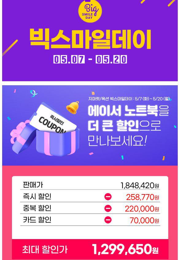 안녕하세요 한성컴퓨터 입니다.오늘부터 지마켓에서 5/7 (화) ~ 5/20 (월)까지 진행되는 빅스마일데이 행사를 맞이하여 에이서 인기 노트북 역대가 할인을 하여 관련 내용 안내 드립니다.본 상품은 한정수량으로 진행되며 예산 소진시 할인쿠폰 등이 조기 종료될 수 있으니 평소 게이밍 노트북에 관심이 있으신 고객분들께서는 참고 부탁드립니다! 카드사의 경우 현재 KB카드, 현대카드, 롯데카드, 삼성카드, 스마일카드 7% 할인 적용이 가능합니다.에이서 노트북에 많은 관심과 성원 부탁드립니다:)