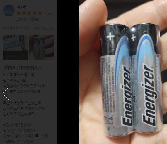 AA 사이즈 배터리는 도어락 때문에라도 상시 비축하는 제품이죠. 지난 1월 27일, 쿠팡 타임딜 가격이 20,820원이었고, 오늘은 좀 더 저렴하네요.더 저렴한 제품도 많지만, 평소 에너자이저 브랜드를 우선시하는 분들에게 괜찮을 듯하네요.[자료1] 24년 1월 27일 쿠팡 타임딜[자료2] 23년 1월 13일 오프라인(대형마트) 시세에너자이저 맥스 플러스 보존 기간은 최대 12년 정도이고, 해당 상품의 최근 포토 리뷰를 찾아보니 2023년 12월 제조로 추정되네요.리뷰 한 개로 모든 재고의 제조 일자가 같다 할 순 없으니, 유효기간이 중요한 분들은 쿠팡에 확인 후 주문하시기 바랍니다. (연휴라 제때 답변 받을 가능성은...)