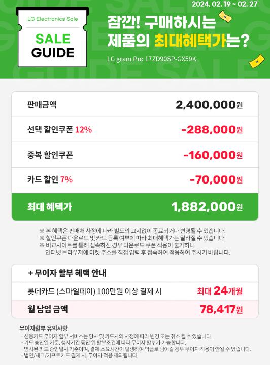 그램17 프로 사전신청 받고 있습니다.18일까지 신청기간이고 19일에 구매가능한거 같네요빅세일쿠폰에 중복할인쿠폰받고 카드7% 할인해서 1,882,000원입니다.사전신청하고 구매하면 신세계상품권 3만원도 지급되네요신청은 가격배너 클릭하시면 됩니다.