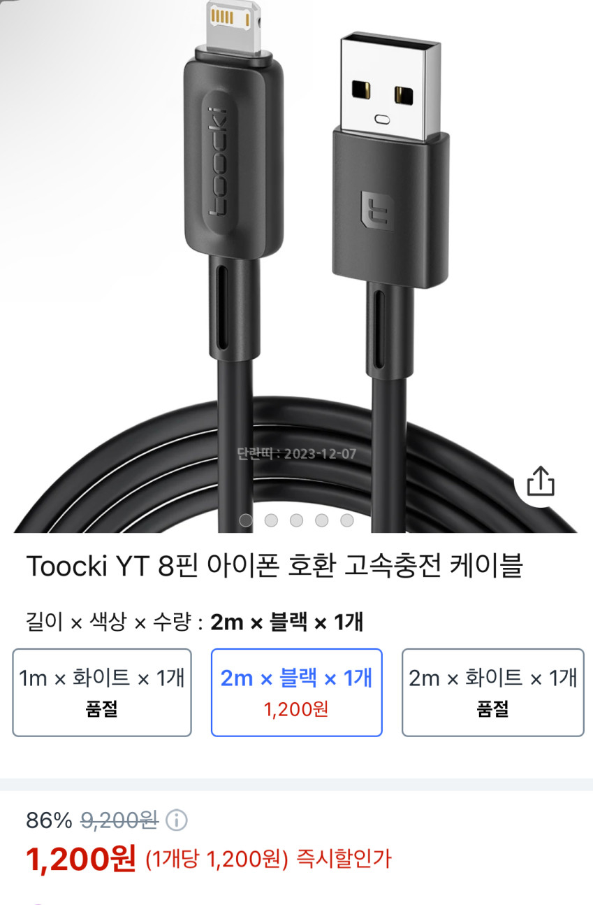 Toocki usb 8핀 아이폰 호환 고속 충전 케이블 1200원