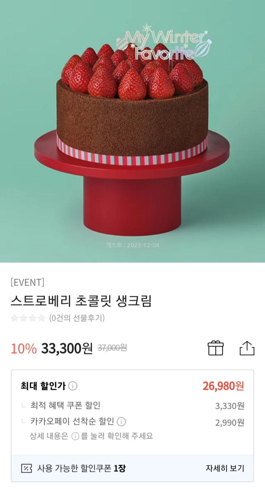 투썸 스트로베리 초콜릿 생크림 케잌 26980원