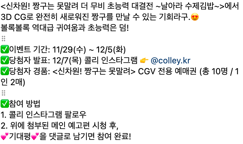 [CGV 예매권] 콜리 인스타그램 댓글 이벤트 (~12/5)