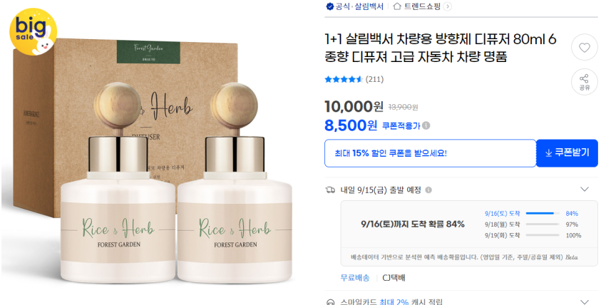 차량용 방향제 80ml 1+1 8500 무배