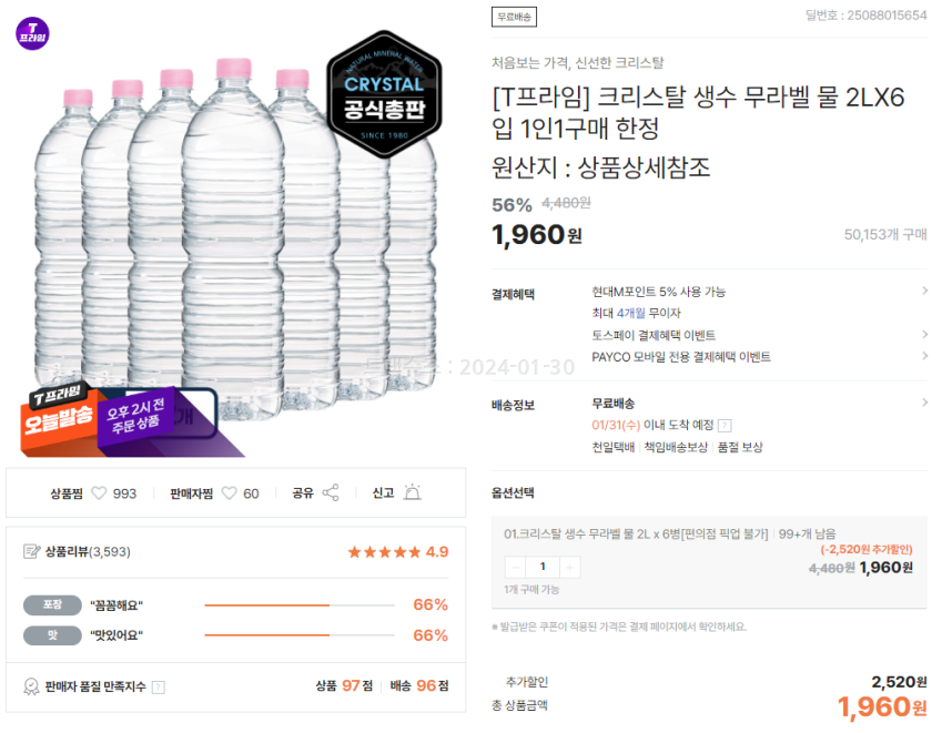 크리스탈 생수 무라벨 물 2L 6개입 1960원