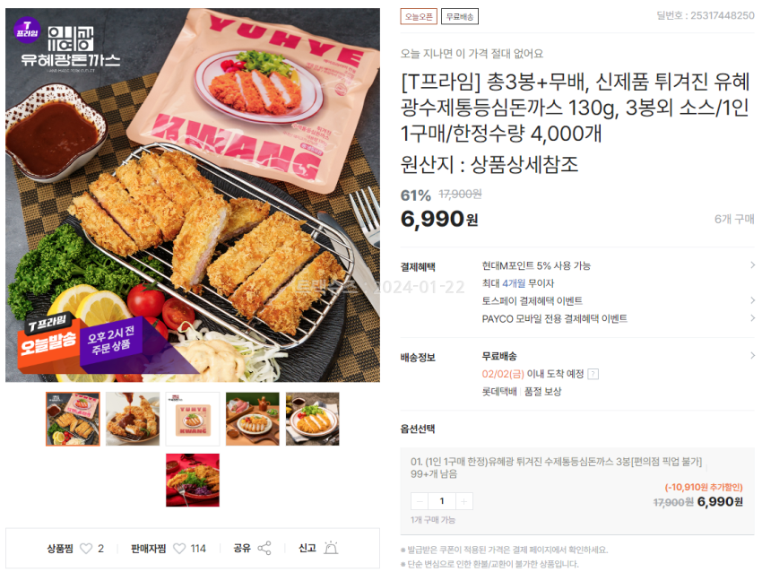선착순 유혜광 튀겨진 통등심돈가스 3봉 6,990원