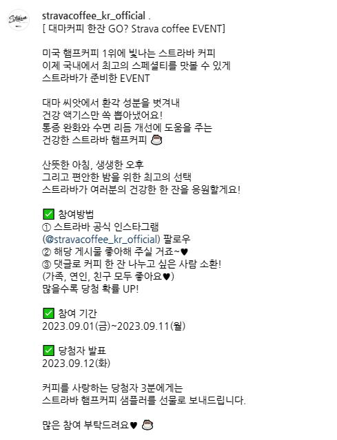 [스트라바] 인스타 팔로우 이벤트 (스트라바 햄프커피 샘플러 3명 증정)