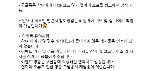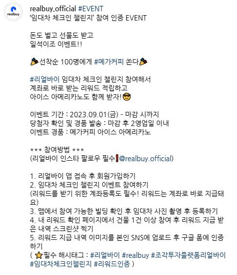 리얼바이 앱 다운 -> 임대차체크인챌린지 이벤트 참여 -> 리워드 지급 내역 캡처 -> 인스타 구글폼 링크에 인증 업로드