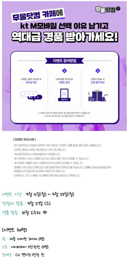 [ktM모바일] 공식카페 게시글 작성 이벤트 (~9/25, 경품:에어팟 3세대, 네이버페이 5만원 등)