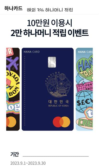 - 하나 트래블로그 카드 10만원 이용시 2만원 하나머니 적립