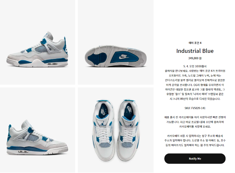 5/4 나이키 코리아 에어 조던 4 밀리터리 블루 발매