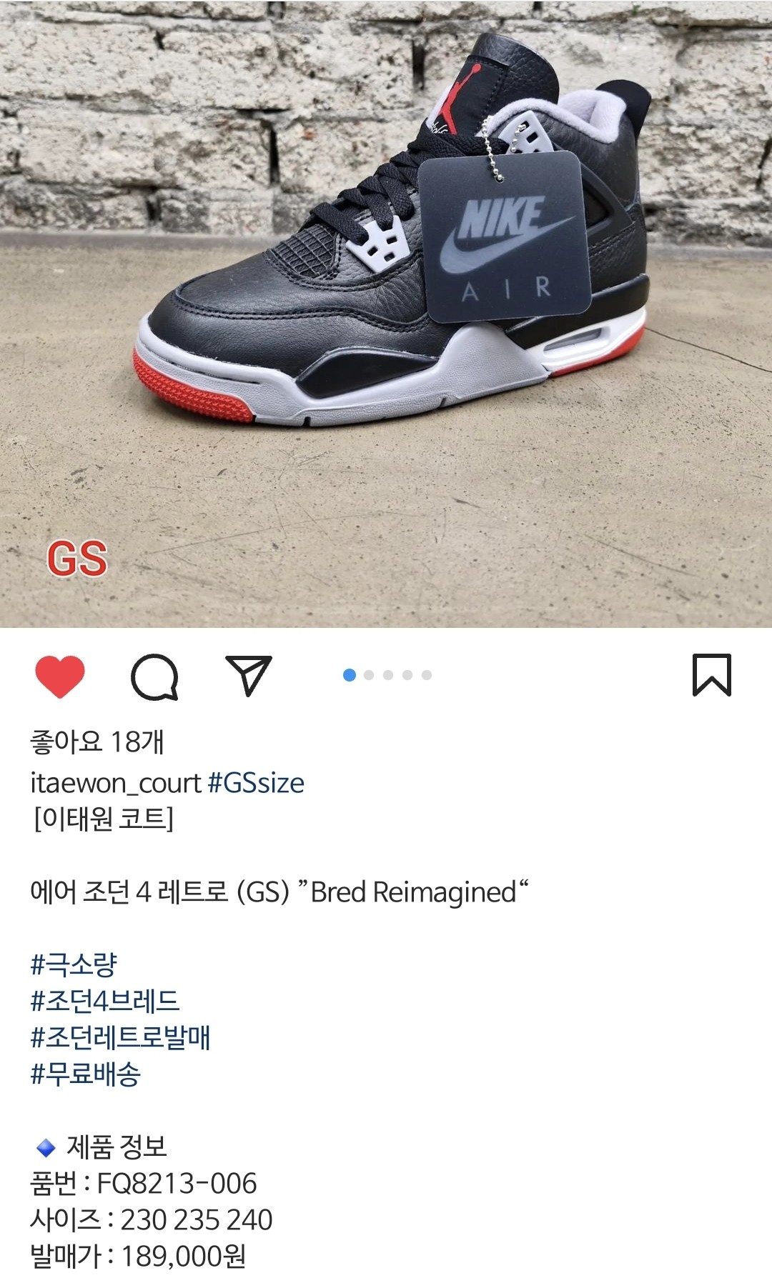 이태원 나이키 타운 에어조던4 GS 리이매진드 브레드 택배 가능